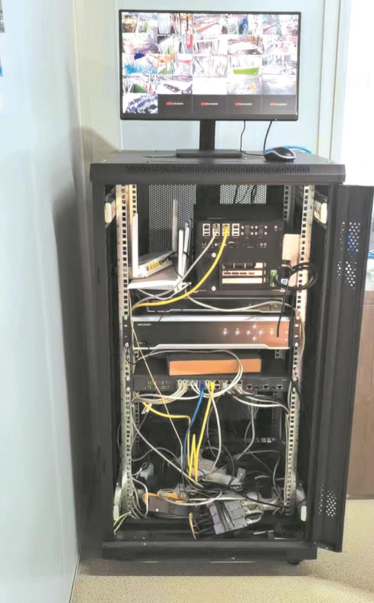 这是项目部采用的高科技设备——“蜂鸟盒子”,虽体积不大,但高科技含量十足。据介绍,它是一款视频图像智能识别的边缘计算服务器。施工现场的视频监控系统将多个摄像头的图像传输到蜂鸟盒子中。蜂鸟盒子依照内部的智能AI算法,进行人工智能化深度学习,对图像进行实时分析,并进行预警。
