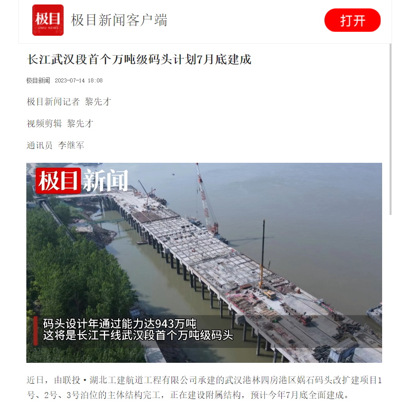 近日,由联投·湖北工建航道工程有限公司承建的武汉港林四房港区娲石码头改扩建项目1号、2号、3号泊位的主体结构完工,正在建设附属结构,预计今年7月底全面建成。