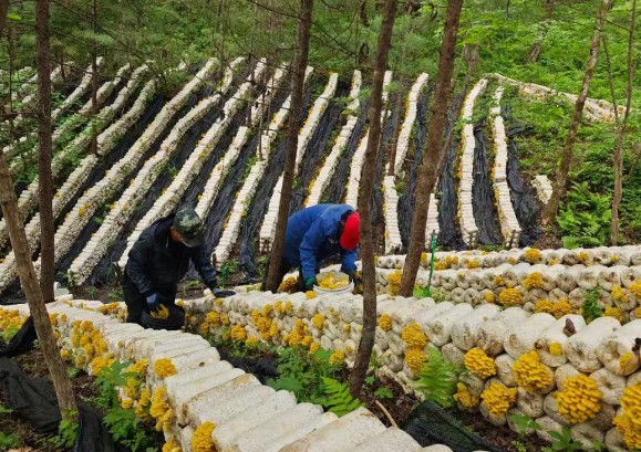 在木耳种植区内,35万袋菌棒整齐排列,场面非常壮观,自动喷淋水管正在为木耳菌棒洒水,保持菌棒湿度,已经有不少小朵小朵的黑木耳从菌棒中探出头来。种植户们穿梭其中不时查看菌棒出芽情况,现场一片忙碌,处处呈现着木耳产业的繁荣景象。 “我们铁山林场自然条件优越,温湿度适宜,很适合种植黑木耳,主要种的就是地栽木耳,这种模式省去了搭建立体架子的成本,直接将菌棒放置在田间地头进行栽培,让木耳在自然环境中茁壮成长,更适合大规模种植,而且简单易上手。这批木耳,等到6月下旬就可以采摘了,能给我们种植户带来很可观的收入。”一位种植户告诉记者。 同样发展得如火如荼的还有榆黄蘑种植产业。在茂密的林地间,泥土树木的香气混杂着菌菇特有的清香在空气中肆意弥漫,一个个榆黄蘑菌包静静地躺在地上,享受着肥沃黑土地的滋养,遮天蔽日的森林挡住了过于炎热的太阳,湿润阴凉的气候为榆黄蘑的生长提供了天然温床。