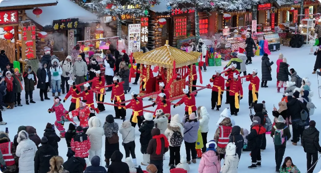 今年的雪乡故里,将民俗喜庆氛围推向了新高潮。安塞腰鼓、东北大秧歌与二十四节令鼓的快闪表演随机上演,鼓点与欢笑声交织,为冰雪秘境增添喜庆氛围。而全新推出的 NPC 体验式抢亲节目,成为文旅体验的亮点,活动融合达斡尔族迎亲习俗与现代婚庆互动玩法,游客可化身伴郎伴娘出谋划策,或作为围观乡亲加油喝彩,在趣味关卡与红包祝福中深度感受东北婚嫁文化的热闹与温情。