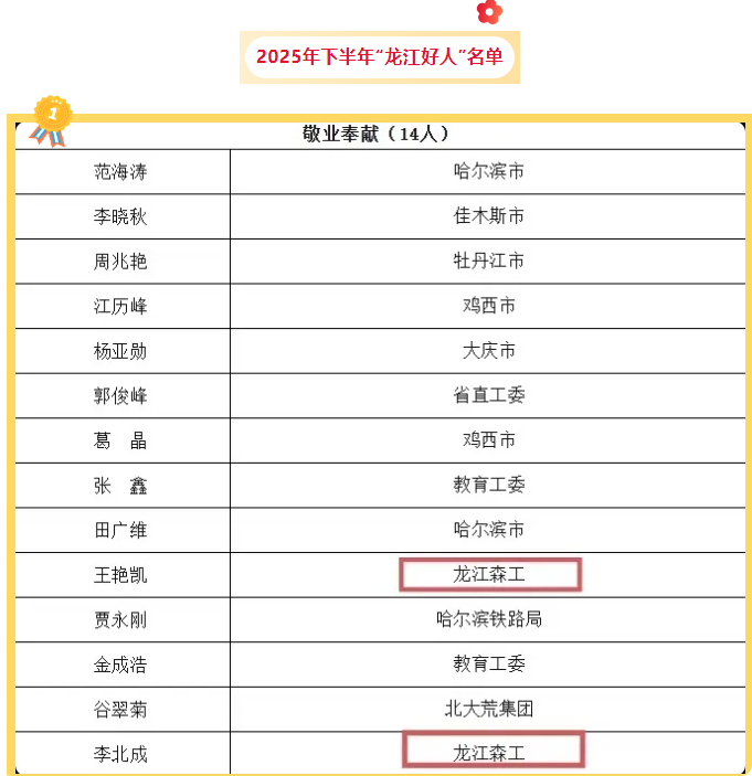 日前,黑龙江省文明办公布2025年下半年“龙江好人榜”,龙江雷速(中国)一站式服务官网集团李北成和王艳凯入选敬业奉献类“龙江好人”。