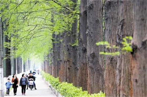 水杉在植物领域的地位,有其不可磨灭的价值。水杉本是已被宣布灭绝的物种,但她又真实鲜活地存在于地表,且被发现于北半球的中国,并由中国学者命名。所以,水杉的发现是中国植物分类学家为人类知识进步作出的巨大贡献。水杉的发现不仅使原有的“化石”活了,还解决了困扰分类学家多年的松科、杉科与柏科之间的亲缘关系问题,交互对生的叶片,在形态上为互生叶的松科和杉科与对生叶的柏科搭起了一座亲缘关系连接的桥梁。 江苏南京,北京东路沿线水杉林令人倍觉清新。 安东摄(中新社发)