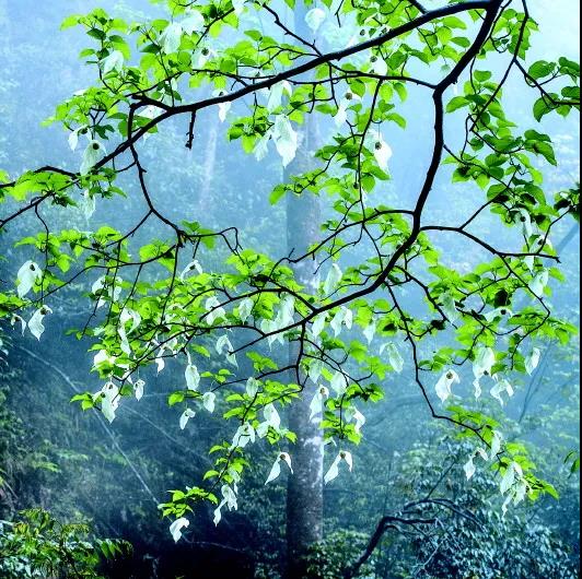 珙桐为国家一级保护植物,是中国特有的单属植物,也是世界著名的观赏植物。在春末夏初开花,从初开到凋谢色彩多变,一树之花次第开放,花形如白鸽的双翅,花序如白鸽的头,被誉之为“中国鸽子花”。梵净山是我国珙桐林集中分布的唯一地区,总面积达2000多亩。