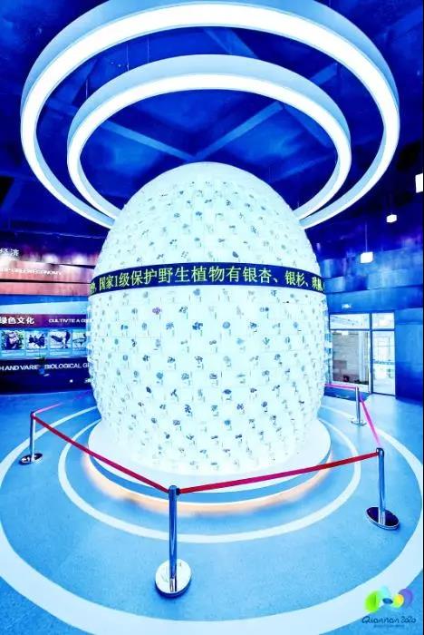 有着“深山中的生命密码”之称的梵净山冷杉,属于国家一级保护植物,列入《中国生物多样性红色名录——高等植物卷》濒危等级。梵净山冷杉是迄今为止最后发现的一种冷杉及其形成的冷杉垂直带群落,目前仅有数千株。 竹中“高富帅”毛环方竹,主要生长在贵州都匀斗篷山海拔1100米左右的高山上,被列为国家濒危植物。 作为生命的根基,种子起源于3亿年前,是种子植物最为复杂的器官之一,但由于大多数种子体积都较小,不甚起眼,人们很少去关注它。如今站在这个巨大的松果型装置前,每一颗种子在灯光映衬下都散发出独特的光芒。“原来红豆树的种子是这样!快来看皂荚的种子!”游人好奇的声音不时在“生物基因库”展区响起。