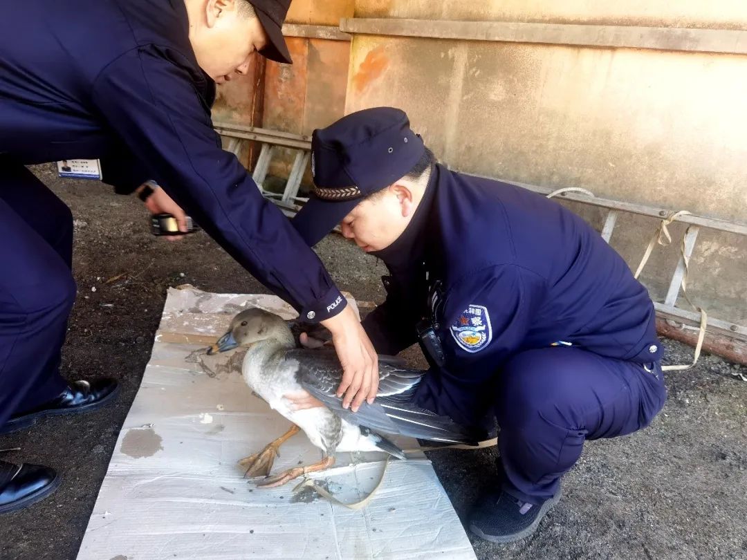 10月7日,黑龙江省林区公安局大海林分局红旗派出所接到林场职工电话,称在路边上发现一只“大鸟”,疑似受伤,无法行动。 民警到达现场后,看见一只形态类似家鹅,头、颈棕褐色,肩、背灰褐色的大鸟趴在地上。将“大鸟”带回派出所后,民警马上联系了大海林林业局有限公司野生动物救助部门。经技术人员鉴定,受伤的“大鸟”系豆雁,是大型雁类属国家“三有动物”(即有生态、科学、社会价值)。经过仔细检查,发现这只豆雁双腿均有受伤,民警配合技术人员对其进行包扎处理,并进行紧急治疗、喂水、喂食、留观。