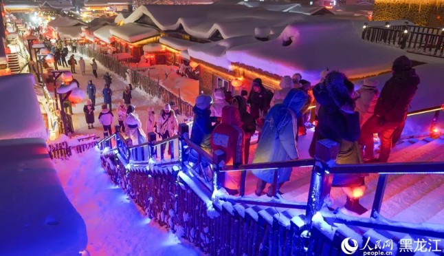 花车巡游、烟花秀、雪地蹦迪……新年期间,“年味儿”十足的雪乡景区为游客们提供更加多样化的游玩选择。造型各异的花车穿梭在雪韵大街,人声鼎沸的蹦迪广场如火如荼,绚丽的灯光秀交织出各种图案,五彩斑斓的烟花绽放在雪乡的夜空。(图片由人民网记者张哲鑫拍摄)